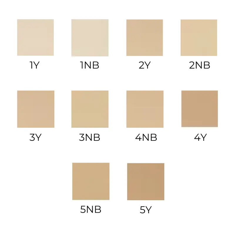 1Y Vanila ,1NB Ultra Beige Pale ,2Y Clear Nude ,2NB Ultra Beige Clear ,3Y Nude ,3NB Ultra Beige Nude ,4Y Gilded Nude ,4NB Gilded Beige ,5NB Honey Beige ,5Y Honey |