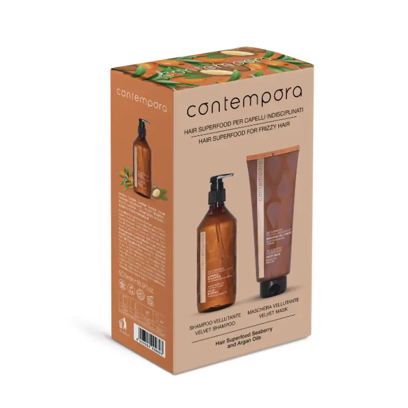 BAREX CONTEMPORA Velvet rinkinys nepaklusniems plaukams – tai profesionali, glotninanti plaukų priežiūros sistema, skirta besipučiantiems, šiurkštiems ir sunkiai suvaldomiems plaukams. Rinkinį sudaro didelės talpos šampūnas ir intensyviai veikianti kaukė, kurie veikia sinergiškai, kad plaukai taptų švelnūs, glotnūs ir lengvai valdomi. Formulės praturtintos augaliniais ekstraktais ir drėkinančiais komponentais, kurie padeda kontroliuoti pūtimąsi, saugo nuo drėgmės poveikio ir išlygina plauko paviršių. Reguliariai naudojant, plaukai tampa paklusnesni, labiau blizgūs ir vizualiai sveikesni, neprarandant natūralaus lengvumo. Rinkinys puikiai tinka tiek kasdieniam naudojimui namuose, tiek profesionaliai priežiūrai salone.
