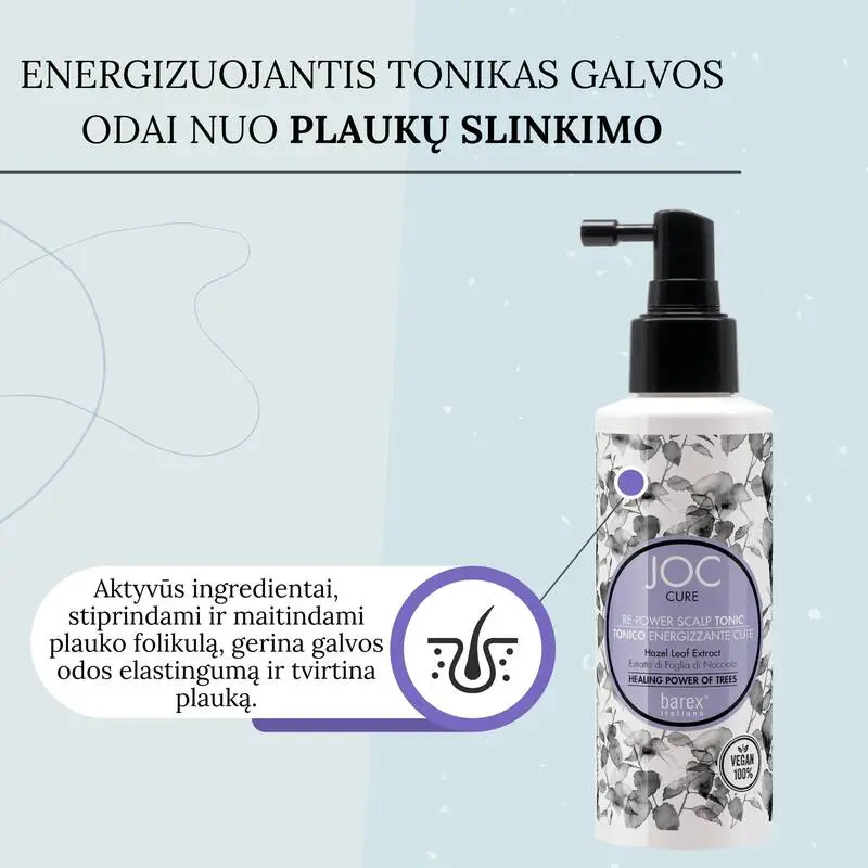 BAREX JOC CURE energizuojantis šampūnas nuo plaukų slinkimo sukurtas stiprinti plaukus ir skatinti jų natūralų augimą. Jo sudėtyje esantys aktyvūs komponentai gaivina galvos odą, atstato mikrocirkuliaciją ir aprūpina šaknis reikalingomis maistinėmis medžiagomis. Šampūnas švelniai, bet efektyviai valo, pašalina apnašas ir perteklinius riebalus, leisdamas aktyvioms medžiagoms veikti tiesiogiai folikuluose. Reguliarus naudojimas padeda mažinti plaukų slinkimą, suteikia plaukams energijos, gyvybingumo ir tvirtumo. Tinka tiek vyrams, tiek moterims, ieškantiems profesionalios pagalbos plaukų stiprinimui. Jo formulė be SLS, parabenų ir silikonų užtikrina švelnų, saugų poveikį galvos odai ir plaukams. Šampūnas atkuria natūralų balansą, suteikia gaivumo pojūtį ir padeda atstatyti plaukų struktūrą nuo šaknų iki galiukų.