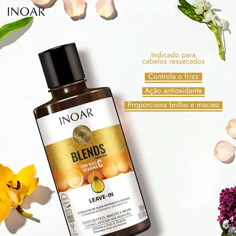 INOAR Blends Leave-In – tai lengvas, drėkinantis ir atkuriantis nenuplaunamas kondicionierius, praturtintas vitaminu Cbei vertingais avokado, kokosų ir argano aliejais. Ši profesionali formulė skirta intensyviai drėkinti, glotninti ir apsaugoti plaukus nuo išsausėjimo bei karščio poveikio. Priemonė padeda užkirsti kelią lūžinėjimui, suteikia plaukams minkštumo, elastingumo ir spindesio. Lengva tekstūra neapsunkina, todėl plaukai lieka lengvi, švelnūs ir lengvai iššukuojami. Idealu kasdieniam naudojimui – tiek natūraliems, tiek dažytiems ar pažeistiems plaukams.