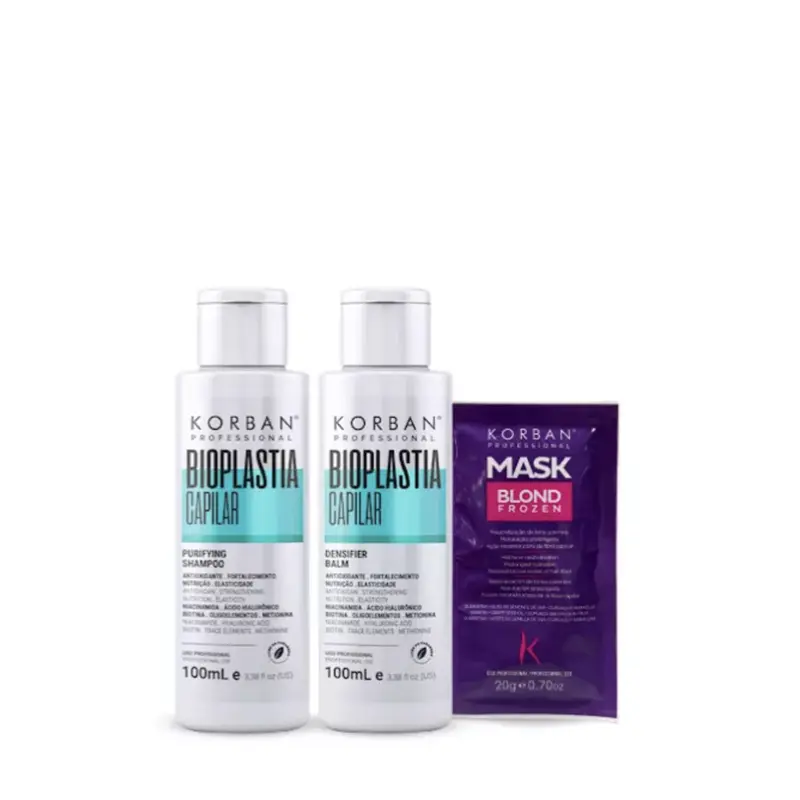KORBAN Bioplastia Capilar Rinkinys Šviesių Plaukų Priežiūrai – tai profesionalus trijų etapų sprendimas, specialiai sukurtas šviesintiems, balintiems ir pažeistiems plaukams. Kiekviena priemonė veikia sinergiškai. Šampūnas švelniai valo ir atstato, Densifier Balm kaukė giliai maitina bei stiprina plauko struktūrą, o Blond Frozen kaukė neutralizuoja nepageidaujamus gelsvus atspalvius, suteikdama plaukams švarų, šaltą toną. Ši sistema su Bioplastijos technologija ir pažangiais aktyviais ingredientais atkuria plauko baltymų balansą, grąžina elastingumą, švelnumą ir spindesį. Rinkinys idealiai tinka tiek kasdieninei priežiūrai, tiek po dažymo ar šviesinimo procedūrų, kai plaukams reikia intensyvios regeneracijos.