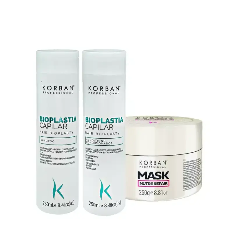 KORBAN BIOPLASTIA CAPILAR – profesionalus intensyviai atstatantis trijų žingsnių plaukų priežiūros rinkinys, sukurtas atkurti pažeistų, sausų ir chemiškai paveiktų plaukų struktūrą. Šis kompleksas sujungia novatorišką bioplastijos technologiją ir galingas veikliąsias medžiagas, kurios giliai maitina, stiprina bei atkuria plauko vidinę struktūrą. Formulė veikia iš vidaus – užpildo pažeistas vietas, glotnina kutikulę ir atkuria plaukų elastingumą bei blizgesį. Po naudojimo plaukai tampa švelnūs, gyvybingi, stiprūs ir elastingi, tarsi po profesionalios procedūros salone.