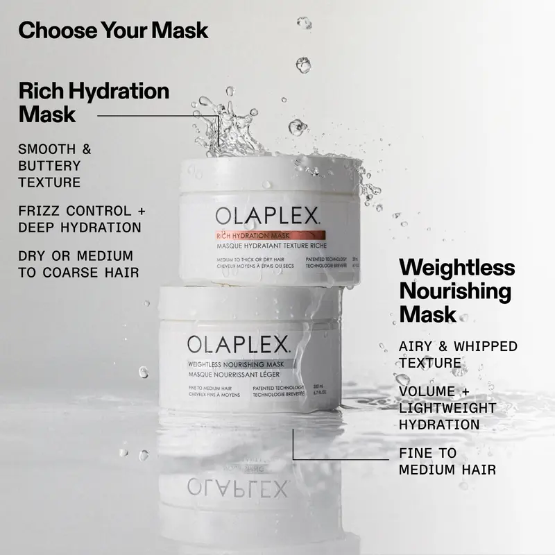 OLAPLEX Weightless Nourishing Mask – itin lengva, tačiau efektyvi plaukų kaukė, sukurta specialiai ploniems ir vidutinio storio plaukams, kuriems trūksta drėgmės ir apimties. Ši pažangi formulė sujungia patentuotą OLAPLEX Bond Building Technology™ su biomimetine kutikulės sandarinimo technologija. Ji padeda išlaikyti plaukų drėgmę net iki 5 plovimų. Kaukė atkuria plaukų stiprumą, sumažina lūžinėjimą ir suteikia jiems natūralų glotnumą bei elastingumą. Unikalus Volume Boost kompleksas pakelia plaukus nuo šaknų, suteikdamas jiems apimties, purumo ir gyvybingumo be apsunkinimo. Lengva, švelni tekstūra užtikrina momentinį drėkinimą, palikdama plaukus žvilgančius, švelnius ir gaivius.